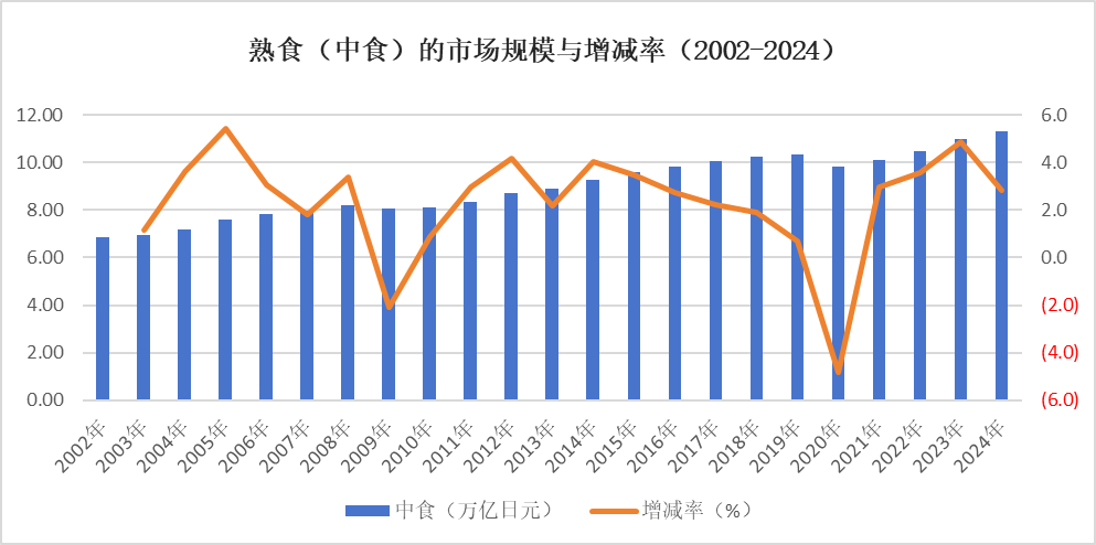 在饮食消费的分类上,日本将外出至餐厅或食堂就餐称为“外食”,在家中自行烹饪称为“内食”,而购买已加工完成、可立即食用的熟食则称为“中食”。因此,熟食市场在日本也常被称作“中食市场”。根据《2025年版熟食白皮书》的数据,2024年日本熟食(中食)市场规模已增至11.29万亿日元,创下历史最高纪录。与2005年相比,20年间市场规模增长48.9%。