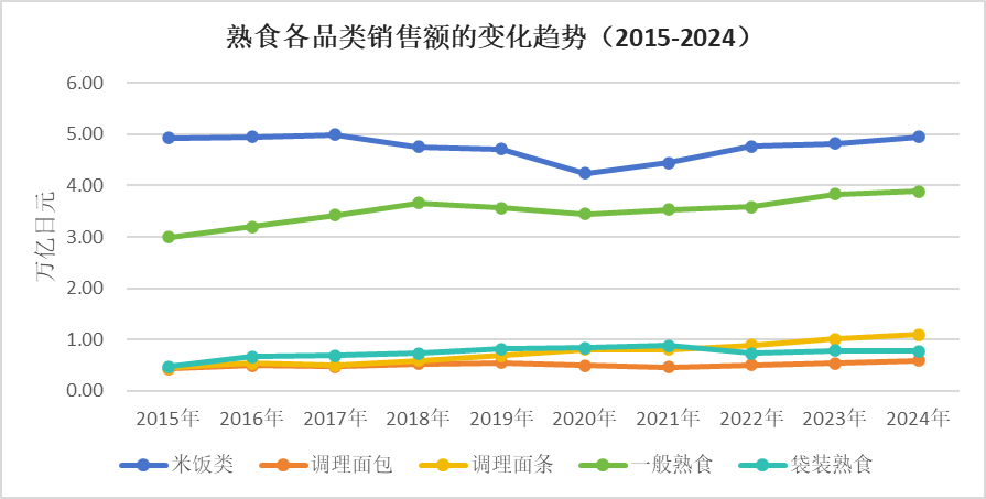 2)一般熟食:涵盖日式、中式、西式等多种烹饪方式(如煮、烤、炒、炸、蒸、拌、腌等)制成的菜肴与沙拉等,2024年销售额为3.89万亿日元,占比34.5%。过去十年间,该类别销售额增长接近1万亿日元,呈现稳步上升趋势。